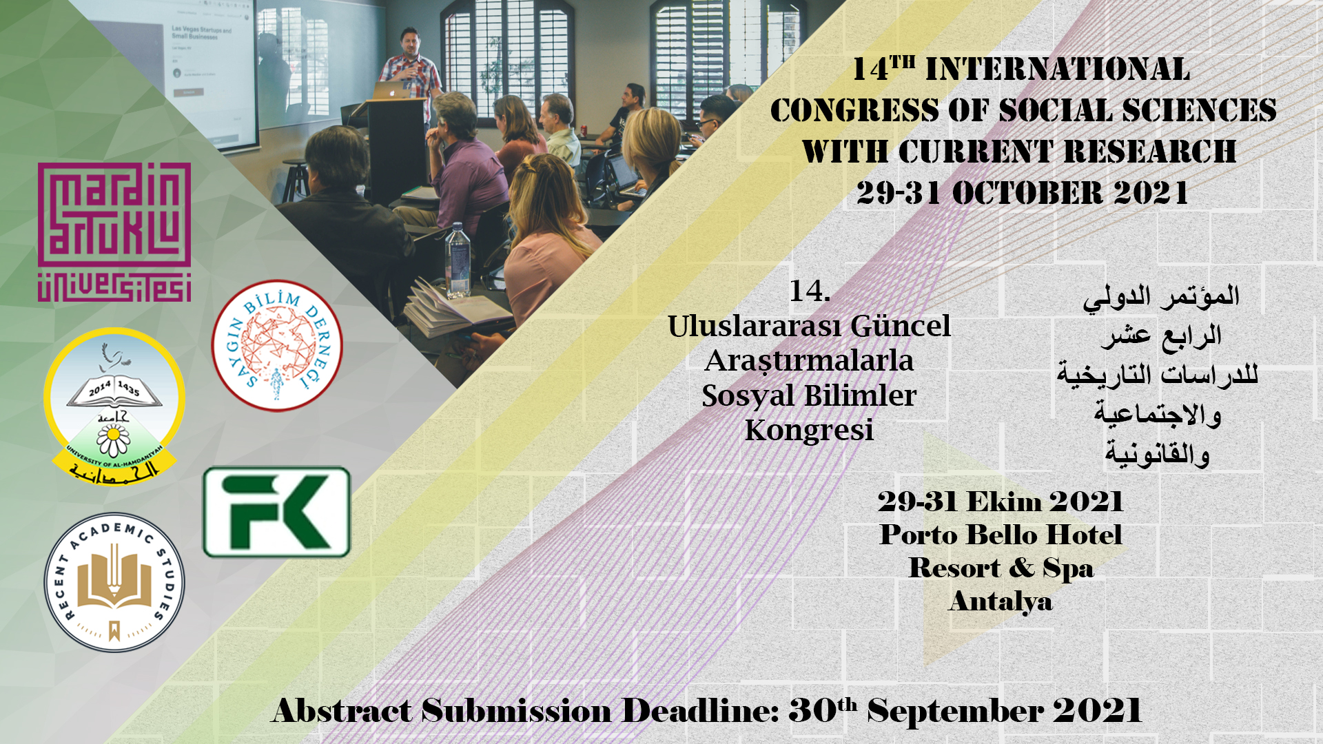 14. Uluslararası Güncel Araştırmalarla Sosyal Bilimler Kongresine sadece sözel bildiri veya özel konulu çalıştay ile iştirak etmek mümkündür.